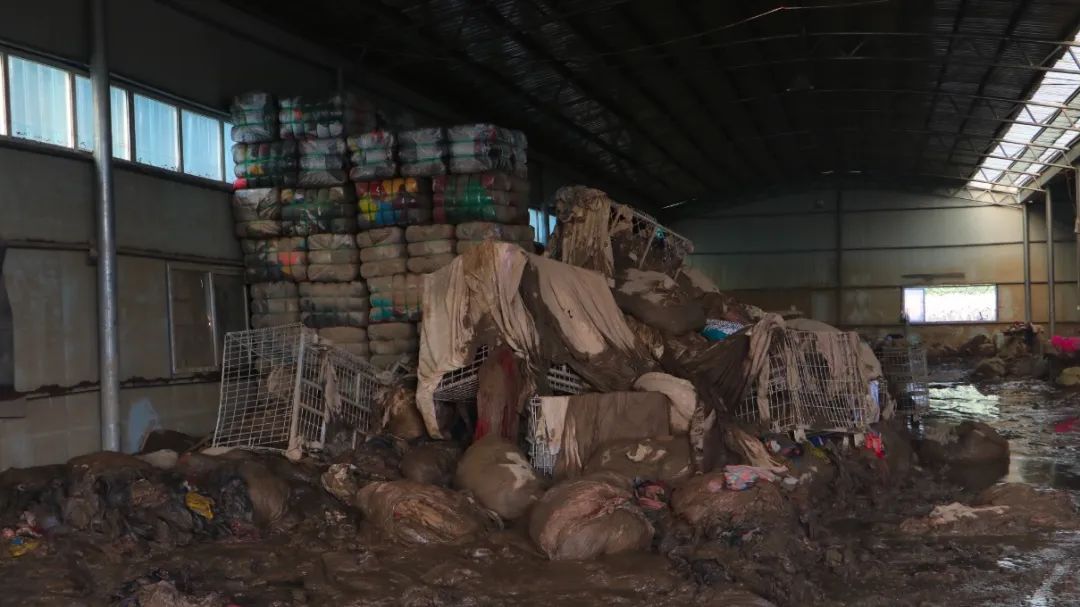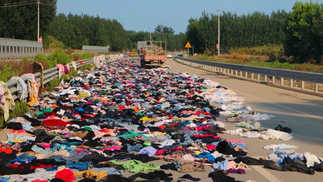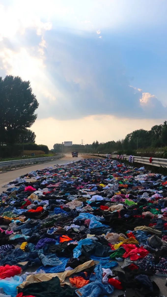 各种式样、花色的衣服,占据了两个车道。李军说这些晒出来的衣服约有两吨,是洗洗以后还能勉强出售的,其他更多的在库房里被淤泥包裹,散发出腐烂的恶臭。
