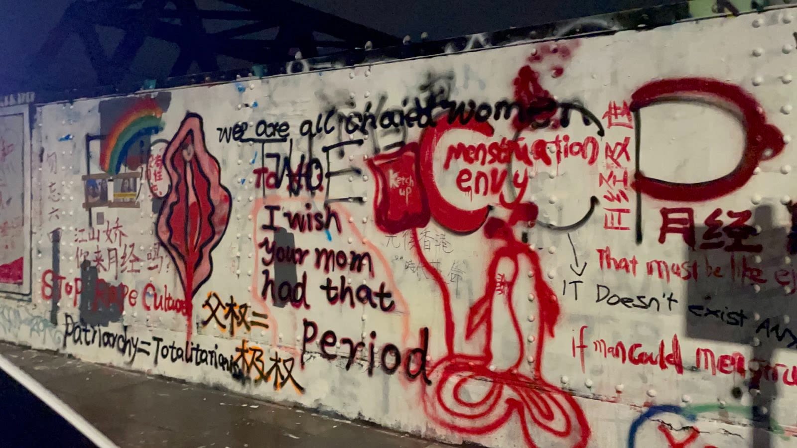 除了政治诉求的二次创作外,细心留意,墙上亦出现了女权主义者所倡议的用语“6B4T”(中国社群称为“六不四脱”,即不结婚、不生育、不恋爱、不与男性发生性行为、不购买厌女产品和单身女性互助;“4T”是指脱束身衣、脱宗教、脱御宅文化和脱偶像)。居住在伦敦的中国女权社群很快就到了红砖巷进行二次创作,其中一个女权行动者Flora表示,从未有任何艺术背景的她和一群女权朋友,一连数天也去了现场创作,她们把“法治”两字用铁链圈上,并写上铁链女;把“民主”挂了一个眼睛,然后写了CCTV 。