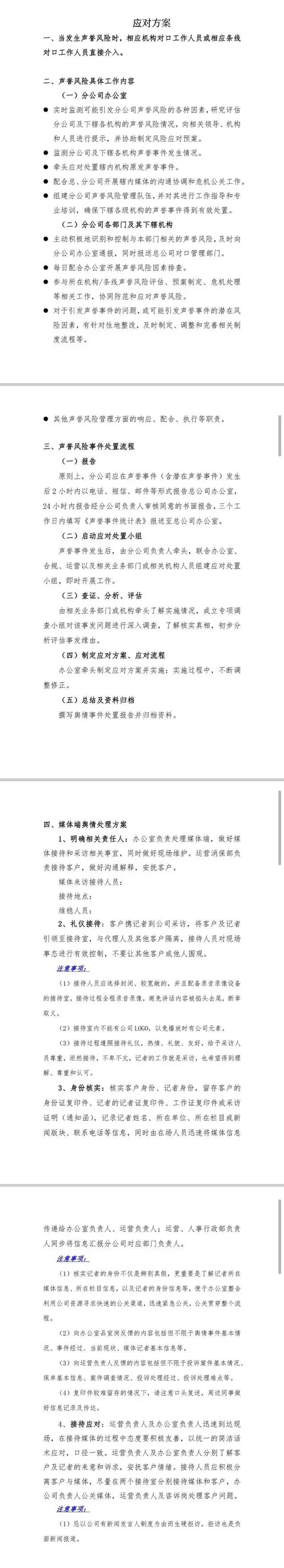 这份“舆情应对方案”流传到网络后,有评论者表示,这家知名保险公司的“舆情应对”手段如此繁多,令人叹为观止,堪称“舆情应对”的教科书。