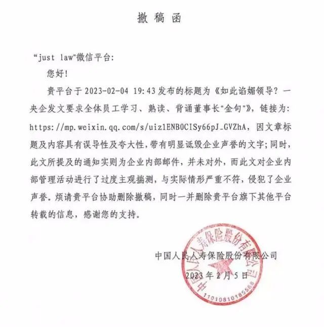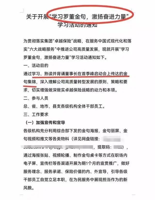 今年2月,笔者发布文章《如此谄媚领导?一央企发文要求全体员工学习、熟读、背诵董事长“金句”》,披露同为知名险企的中国人民人寿保险股份有限公司,要求全体员工熟读、背诵中国人民保险集团股份有限公司党委书记、董事长罗熹的“金句”。