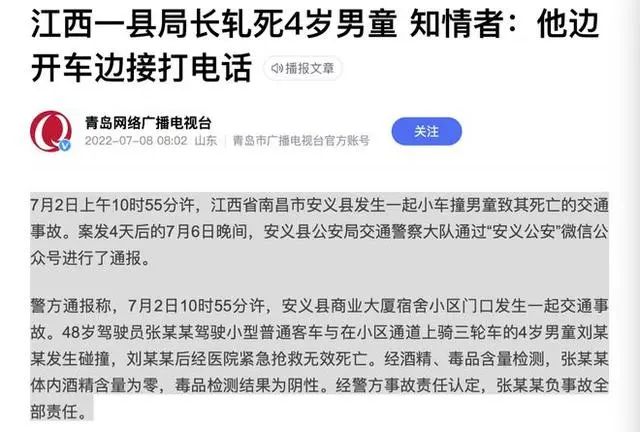 8月31日,笔者从知情人士处获悉,此前引发社会舆论高度关注的江西“局长开车打电话,碾死4岁男童”一案有了最新进展: