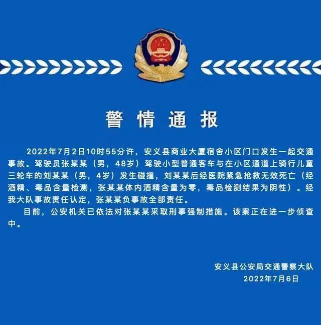 根据此前安义县警方通报,这起“局长碾死幼童”的交通肇事案,发生于2022年7月2日上午10时许,地点位于安义县商业大厦宿舍小区门口。