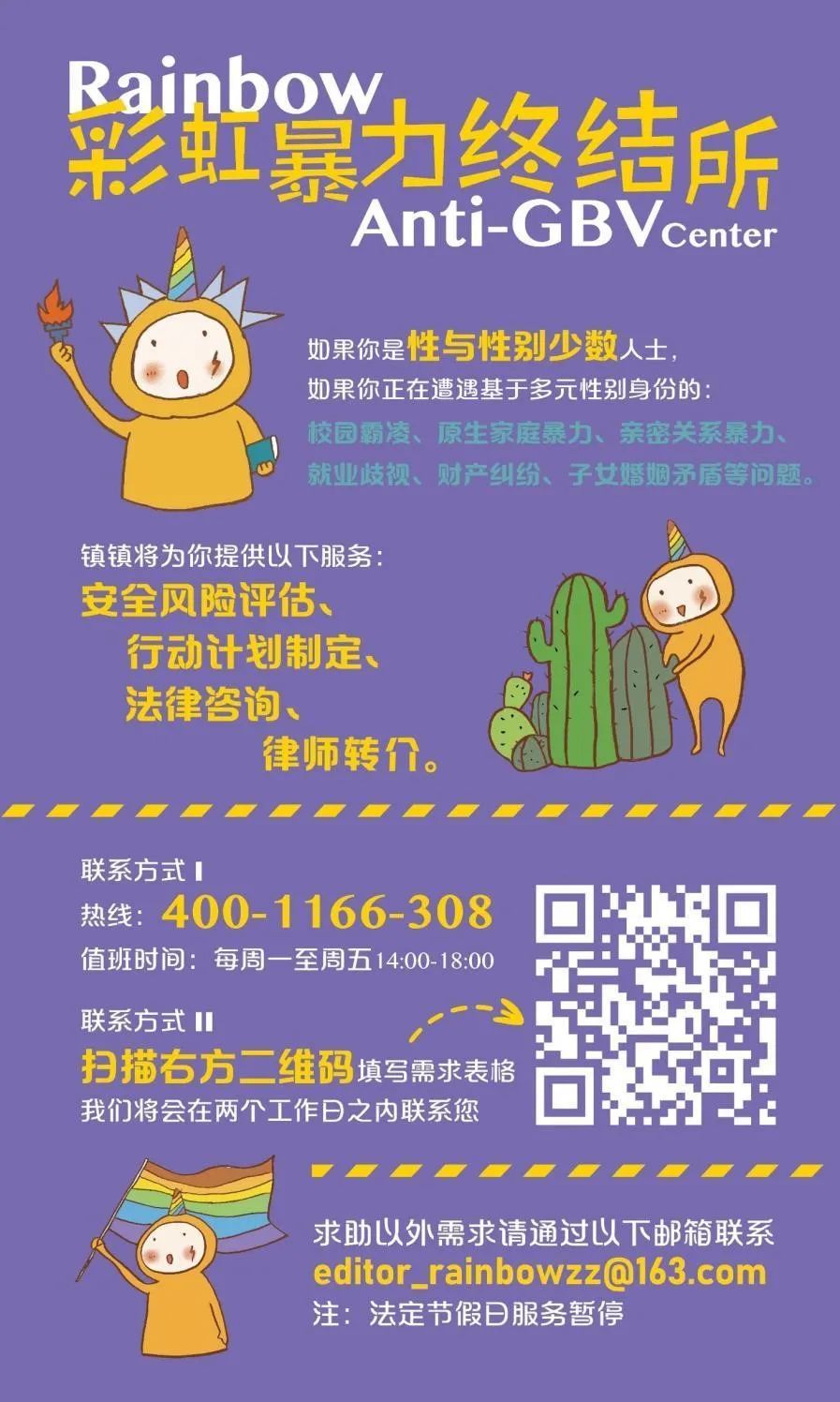 欢迎您保存、分享彩虹暴力终结所的服务海报,我们会为多元性别群体提供专业的反暴力社工服务和法律服务。