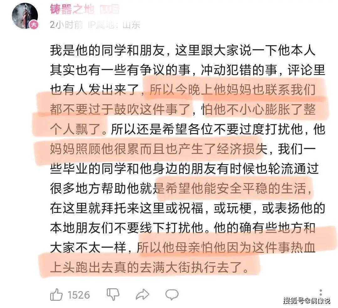 而一个自称是他朋友的人则爆料说,他的精神确实不太稳定,请为他喊好的看客们适可而止,防止这哥们受表扬后热血上头再出去闯祸。