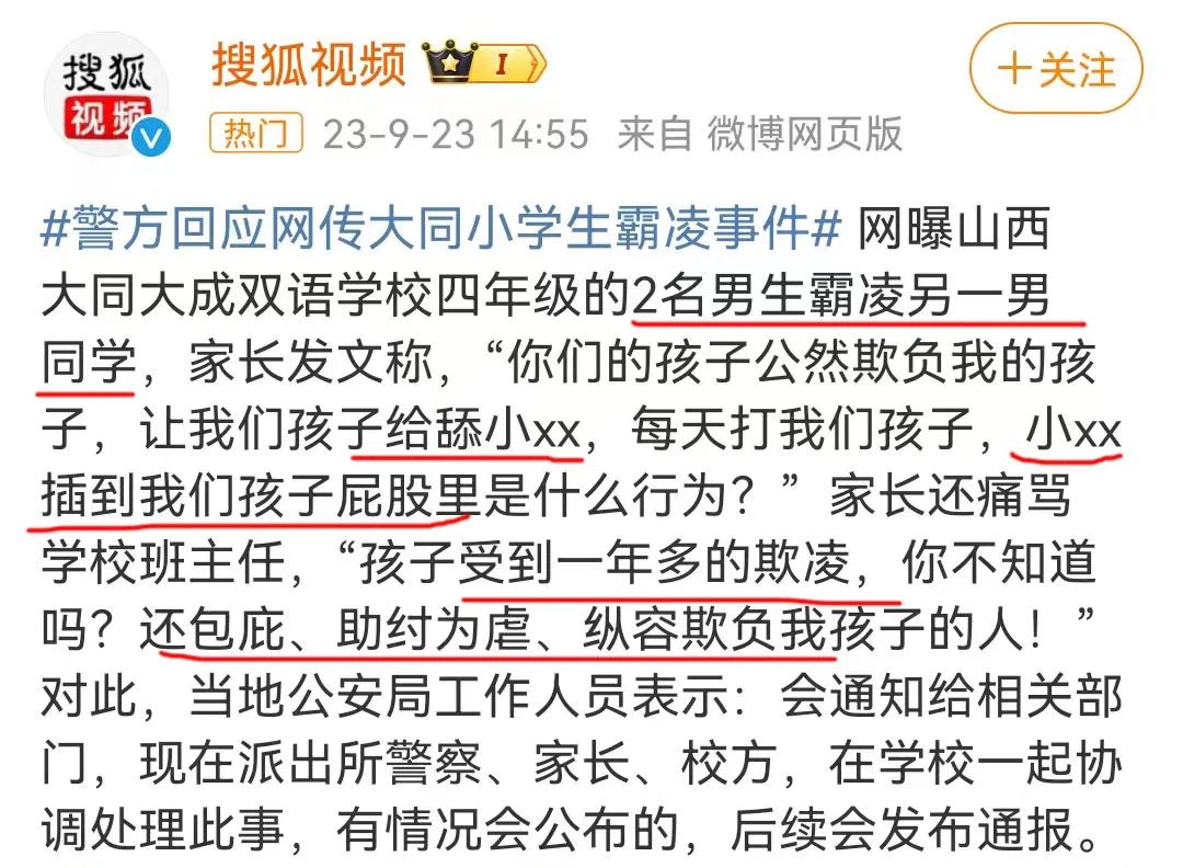 事发后,网上有人爆料,称作恶学生的家长放言:在大同,只要他孩子没杀人,什么事都能摆平!