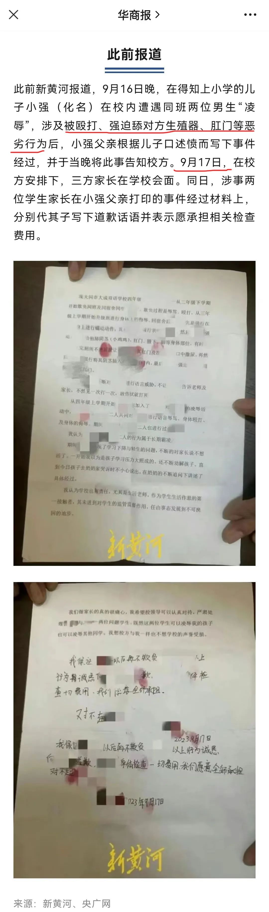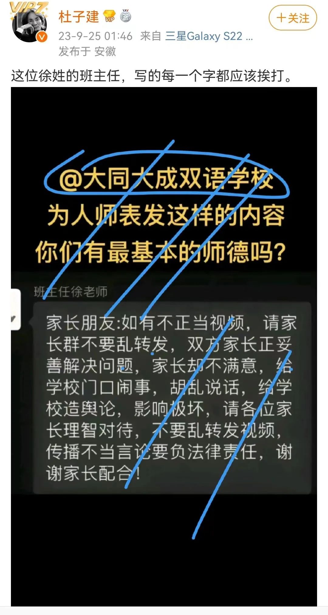 后又有网友曝料,学校的班主任要求所有家长“闭嘴”,言辞之间对被凌辱学生的家长大加指责,“给学校门口闹事,胡乱说话,给学校造舆论,影响极坏”,又威胁转发这一事件的家长,“传播不当言论要负法律责任”。