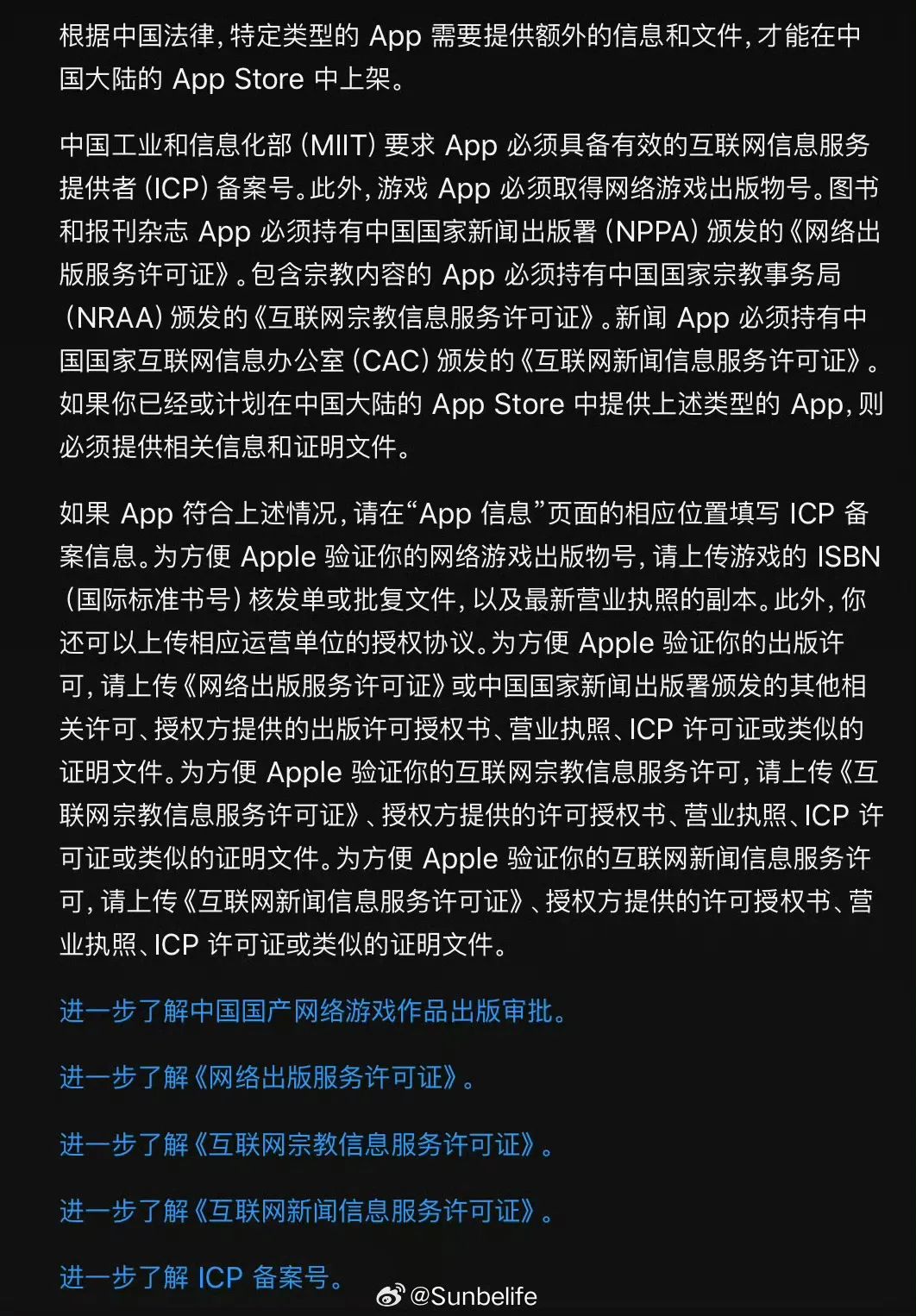 苹果更新了 “App 信息” 中 “在中国大陆的供应情况”,要求 App 有备案号才能在中国大陆的 App Store 中上架。这意味着大部分外国应用将无法通过 App Store 在中国区提供下载。