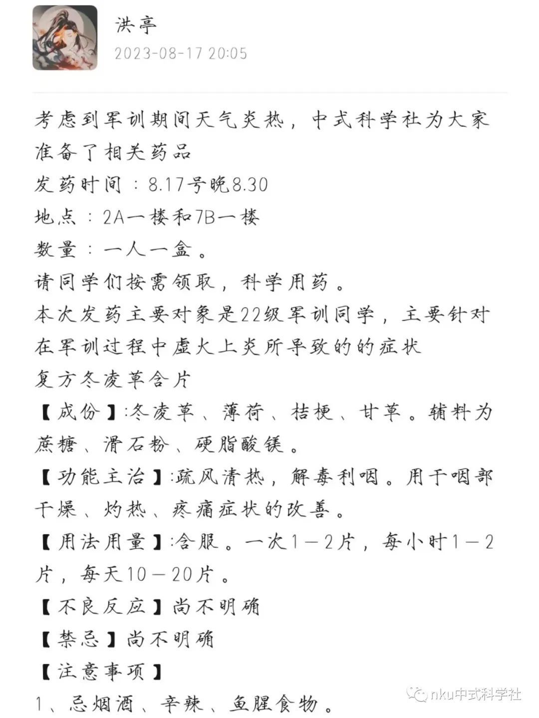 虽然不知道军训期间为什么发这个药,也不知道一群非医学专业的大学生凭什么给大家发药,不过看看成分,冬凌草、薄荷、桔梗、甘草、蔗糖,应该味道还是很不错的。就是这不良反应尚不明确让人不免替姑娘小伙子们捏一把汗……