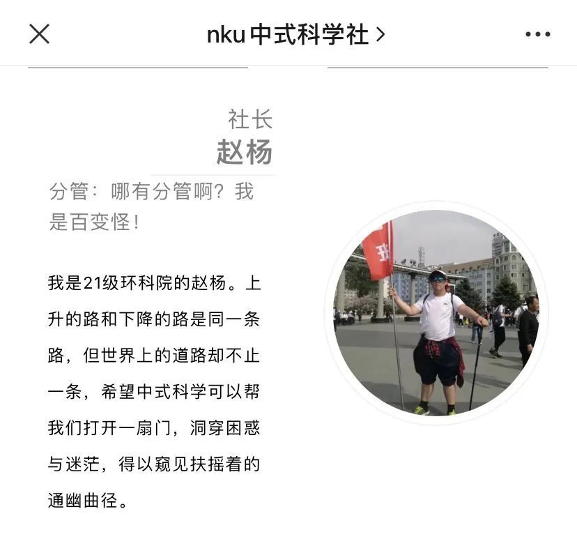 中式科学的奠基人,也是南开大学中式科学社的创始社长,是环境科学学院的赵杨同学,今年大三,双十年华,少年壮志,豪气干云!