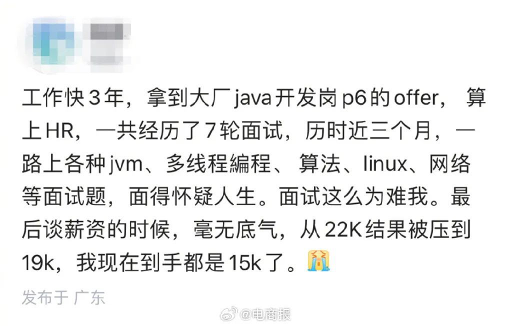 就像是网上的一个案例,面试大厂7轮才拿到offer,薪资却从2.2万降到1.9万,实际到手1.5万,大厂程序员怀疑人生了。