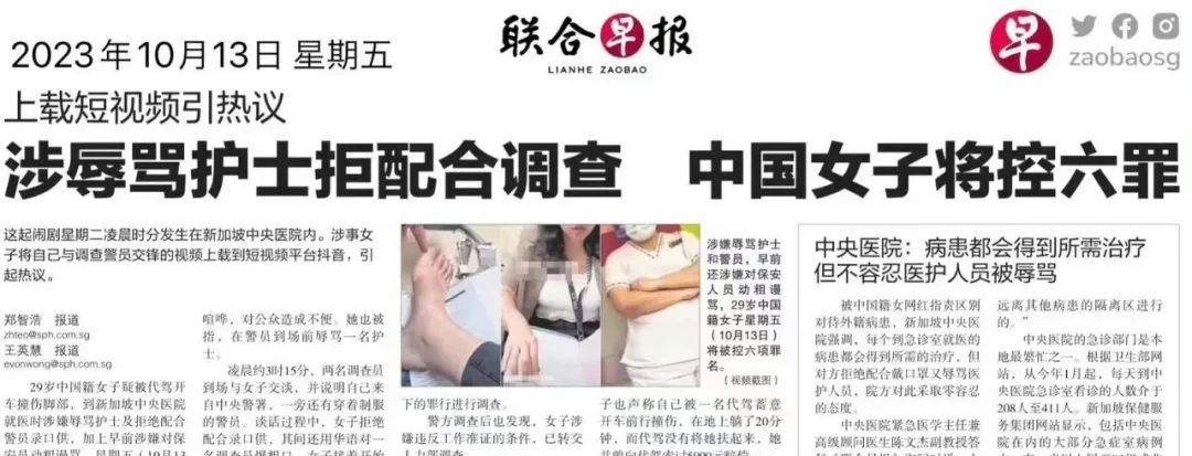 新加坡警方则声明,这是小花第二次被调查。第一次是一周前的10月3日晚上:在滨海舫公寓的44楼走廊和电梯里,她推搡一名保安员的肩膀并扯他的领带,还朝对方飙粗口。这一次,警方认为小花“在中央医院急诊部门大声喧闹,造成公共滋扰,过后还多次辱骂一名医护人员和一名男警员”,将面对六项控状。