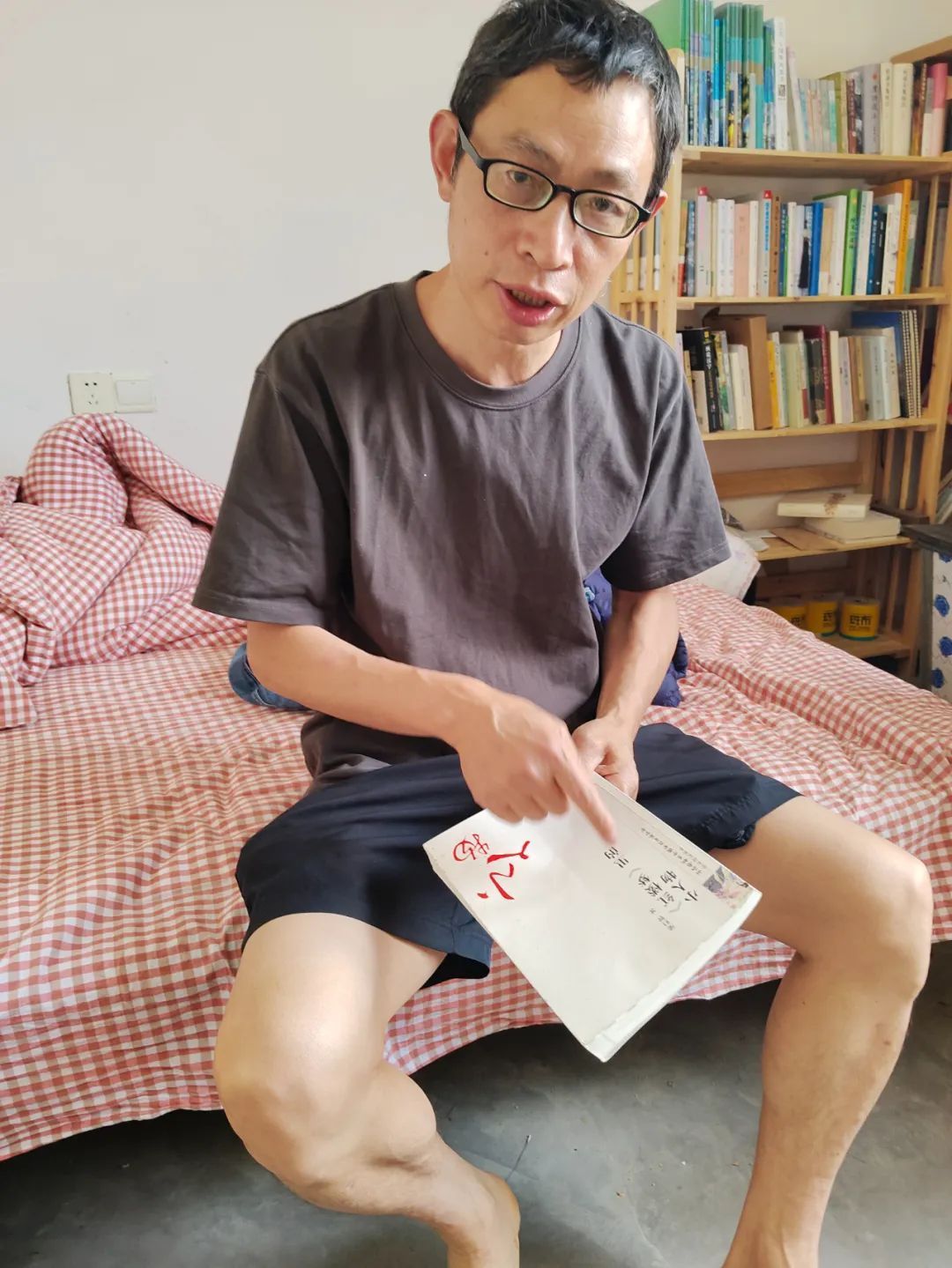 我们见面那天,他穿了件没有任何LOGO的深色T恤,短裤,趿拉着拖鞋。或许因为刚睡过午觉,粉白格的被子随意团成一坨。这是他的书房,墙角摆着一个书架,桌子上放着几本高中教材。