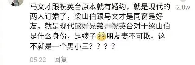 许多经典之作都因此被批判,《廊桥遗梦》的婚外情主题就被批判过,《泰坦尼克号》的男主角被指斥为“男小三”。甚至连《梁祝》都没被放过,有人认为马文才和祝英台早有婚约,梁山伯和马文才是同窗好友,居然撬兄弟墙角,是绝对的“男小三”。