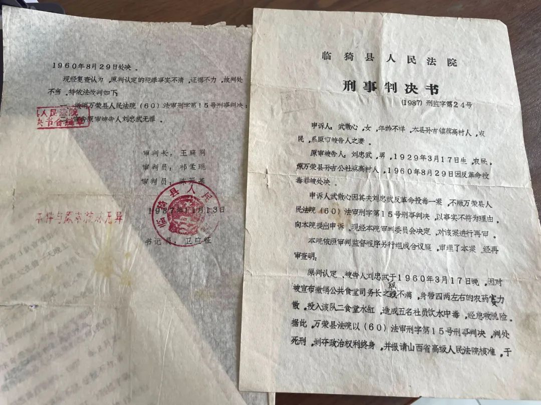 刘青水能做的就是不断写信,1987年,运城市中级人民法院给临猗县人民法院出具批复文件,对被告撤销原判、宣告无罪,撤销山西省高院1960年度的执行令。父亲去世27年后,一家人最终收到了无罪判决书。