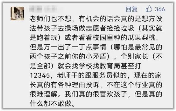 老师和学校也有说法,现在但凡孩子在学校有一点点擦着碰着,家长一个视频捅出去学校就得脱层皮,哪还敢让孩子去疯去跑啊?