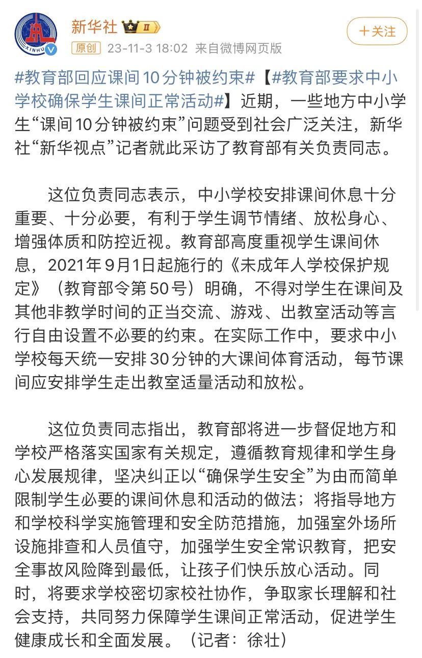 总而言之,课间十分钟不让孩子出教室这件事情里,教育主管部门是被蒙蔽的,教育主管部门本意是好的,教育主管部门改正的决心是坚定的。