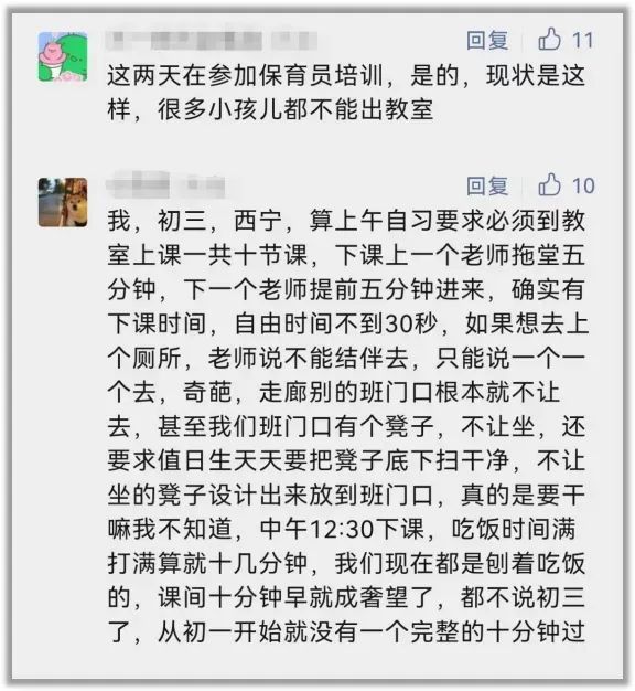 一方面,有这种奇葩规定的远不止个别学校,也不是个别省市。从各地家长的反馈来看,全国范围内有相当比例的小学从疫情期间开始施行这项规定,疫情放开后也并没有还给学生课间自由,甚至有变本加厉的趋势。