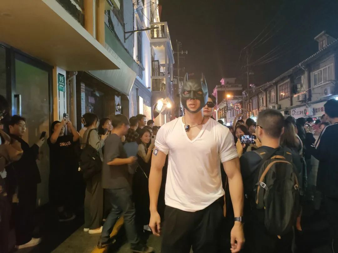 蝙蝠侠们已经巡游两个来回,每次总能引起现场骚动,他们的杀手锏是一言不合就脱掉紧身上衣,袒露出瓷实的胸肌。一圈又一圈人围上来欢呼,外围游客看不到,只管踮脚将举起的手机探往中心拍。
