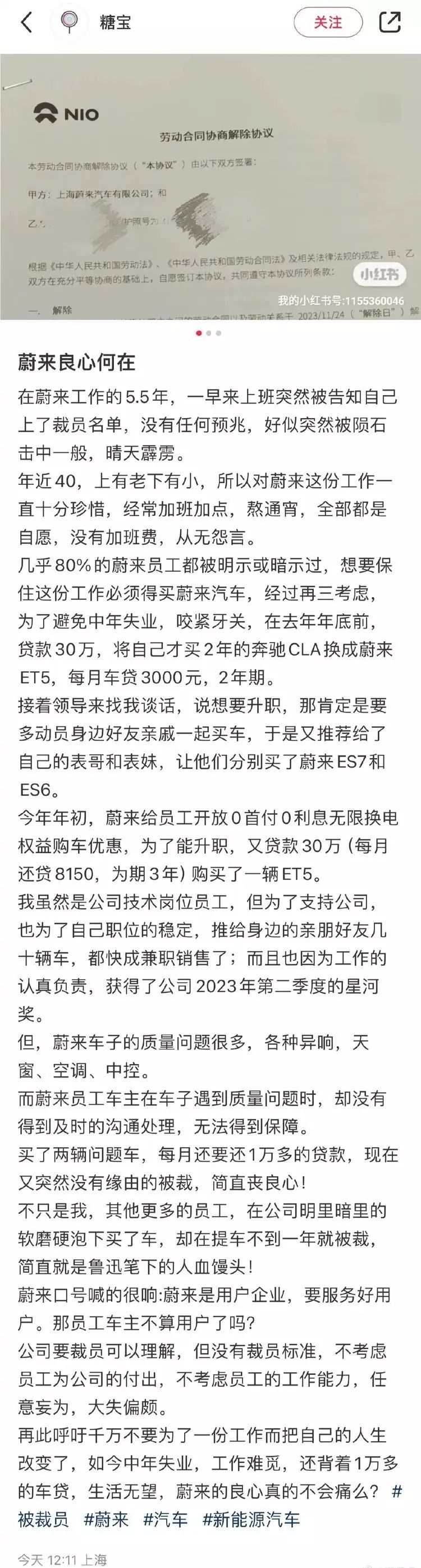 关键是这种局面之下,有网友在某书上发布帖子透露,蔚来有要求员工买蔚来汽车的情况,而该网友自己,就是贷款买了蔚来,结果现在又被裁了,只能拔剑四顾心茫然。。