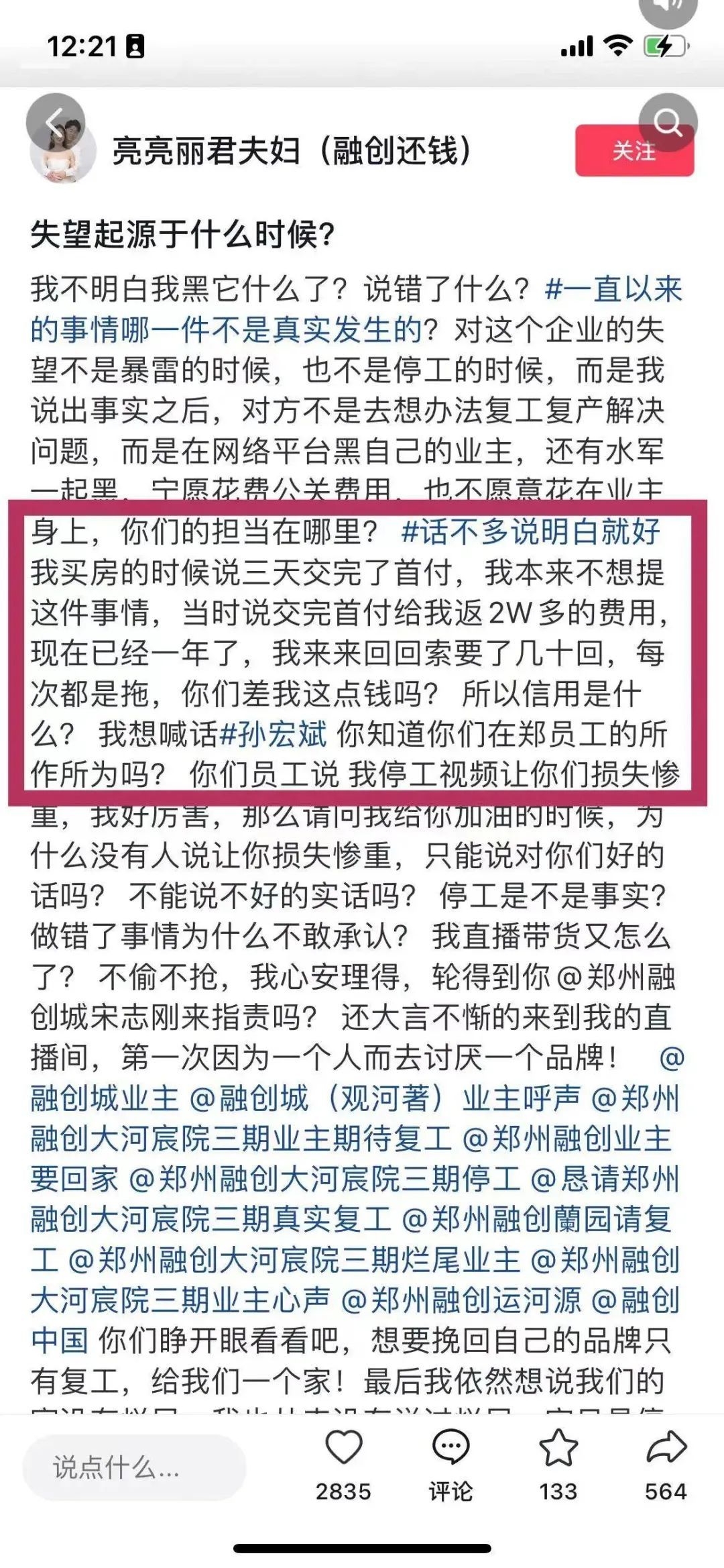 一直关注这对小夫妻视频账号的粉丝,对亮亮口中的这两万块钱,并不陌生。这是他们当初买房时融创承诺的返利款。过去两年,他们已经去索要了多次。