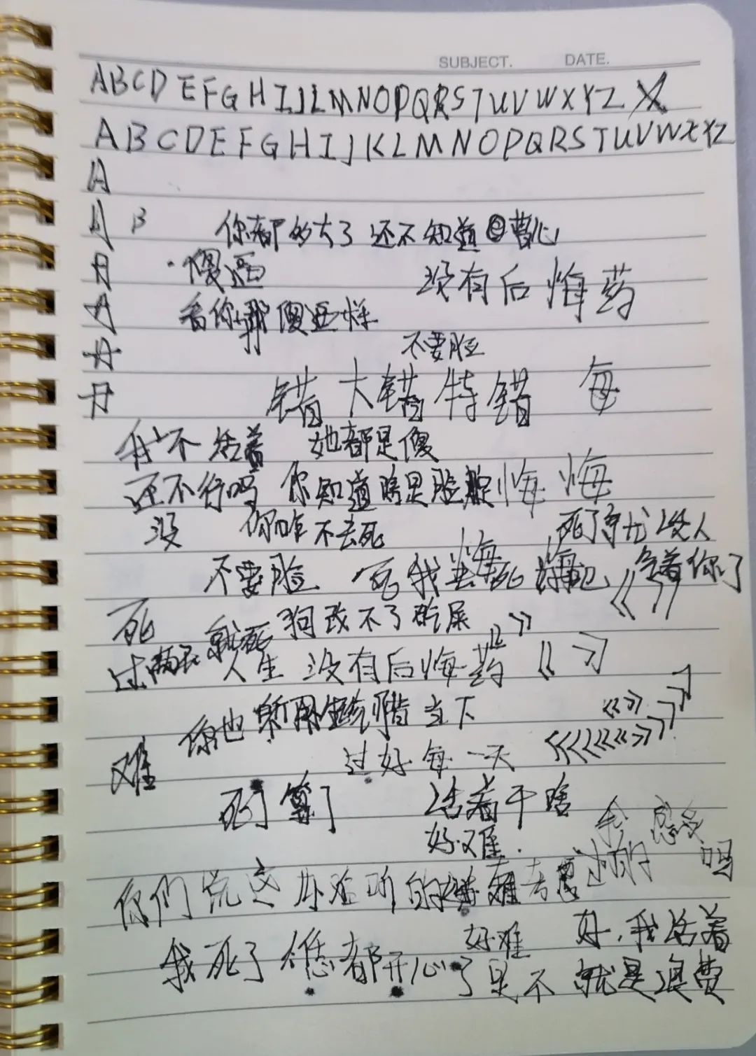 在一页纸上,出现了六次“死”字,她用很大的字写:“死了算了”,“死,过两天就死”,“我死了恁都开心了是吧”,“死了就没人气着你了。”