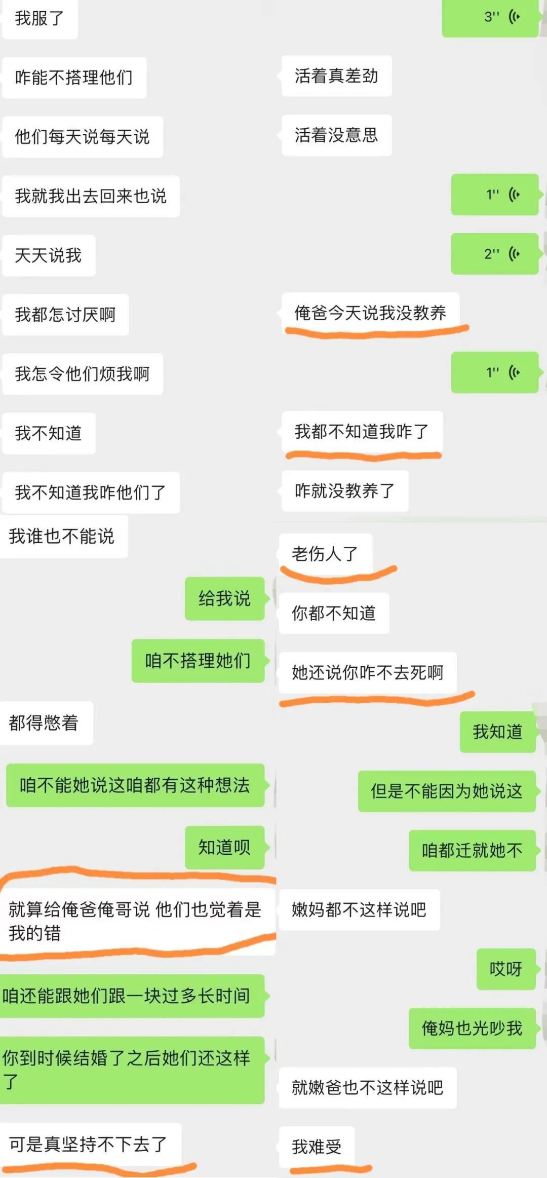 “她的话老狠毒,老伤人了,你都不知道,她说你咋还不去死,恁妈都不这样说,恁爸也不这样说吧。我难受,我谁也不能说都得憋着,就算给俺爸俺哥说,他们也觉得是我的错,可是真坚持不下去了。”