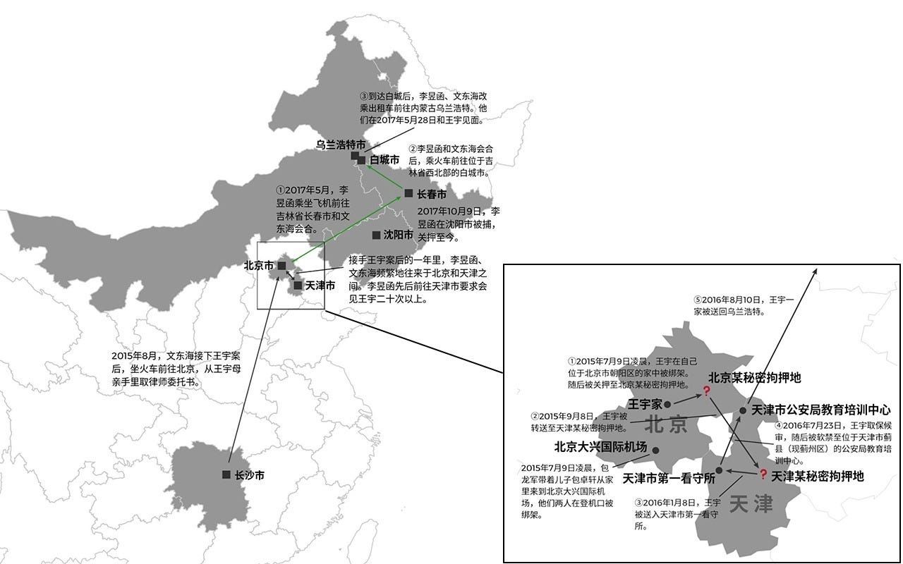 2015年7月9日的凌晨,数十名警察包围了王宇位于北京的住所,将她绑架到她自己至今仍不知位置的秘密拘押地。几个小时前,她的丈夫和儿子在机场被捕。