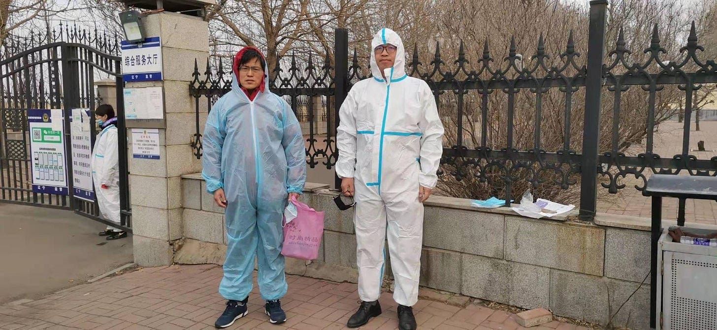 2021年3月12日,律师蔺其磊(左)和姬来松前往沈阳市第一看守所会见李昱函时,在大门外留下了一张合影,此时正值新冠肺炎疫情蔓延之时。在这之后不久,蔺其磊律师因代理“12港人案”被吊销律师执照。《莽莽》/受访者供图