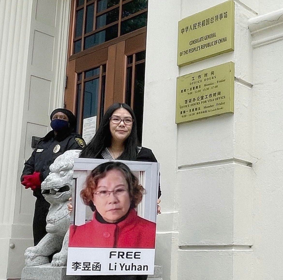 2019年,已流亡美国的艺术家、人权捍卫者向莉在中国驻旧金山总领事馆门前举起写有“FREE Li Yuhan”的标语。向莉/X(Twitter)@xiangli001