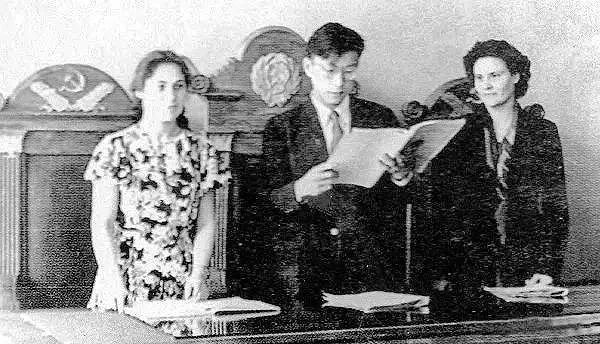 留苏期间,江平(中)在苏联法院实习