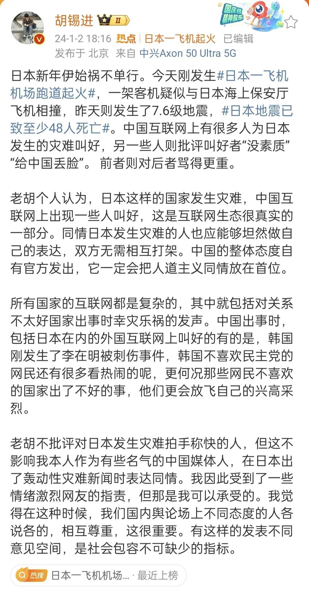 另一方面,就广大基本盘来说,他们对日本和美国死人的事情幸灾乐祸其实是被洗脑、被操控的结果。他们的言行固然令人极度不适,会伤害到善良人的感情,但某种程度上,这些人也是虚假信息与仇恨教育的受害者。比如海南电视台那位主持人,我会批评他,但不会仇恨他。别看他西装革履一片光鲜,但很显然没什么见识,讲出这种话根本不意外。