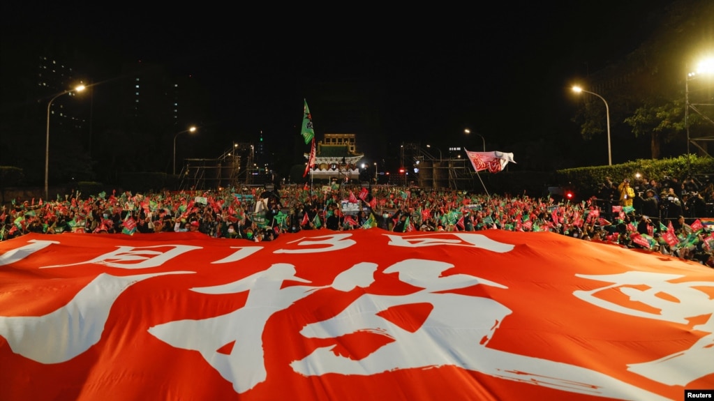 台湾民进党支持者在台湾大选投票日前在台北举行竞选集会,图片来自美国之音