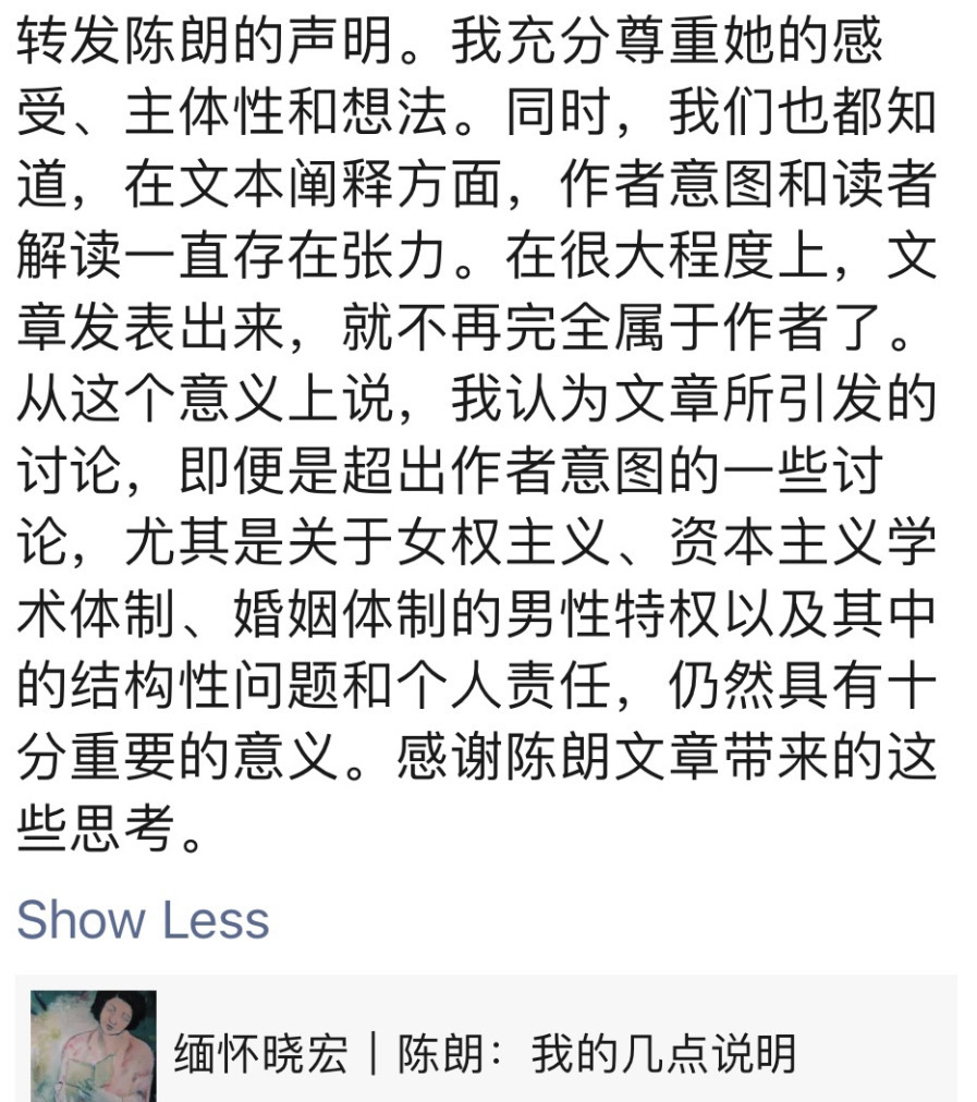 但晓宏不希望也不期待这种沉默。当他听到我内心的尖叫的时候,他绝对不会认为那可以被忽略或和他的成就相抵消。这是一个在男权的结构内,却要做一个女性主义者的男人——这真是一个尴尬的位置。这个位置对他的要求太高了,高得不切实际。男权的结构要他——恐怕也要我在潜意识中想让他——事业成功、养家糊口、挥斥方遒、广交豪杰,关心国事天下事,它甚至告诉他身体疼痛的时候忍着不去看医生。但同时,他也感受着、承担着我的痛苦,却无能为力。他可能没有好好想过,历史上的多数学术大师们背后恐怕不是殷实的家底,就是甘心情愿伺候他们、为他们奉献一生的女人们。可能在他心里,他自己永远是那个从浙江山村蹦跶到北大、又蹦跶到耶鲁的孩子,以为自己是自由的,以为凭着一颗聪明的大脑、刻苦努力,还有善良,一切皆有可能。
