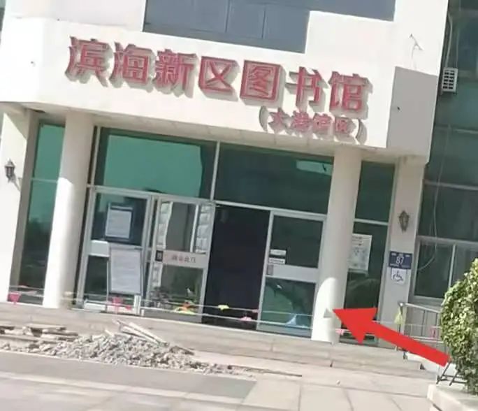 图为当时图书馆门口的情景:无障碍坡道的出口处,即图书馆的门口有一根柱子。