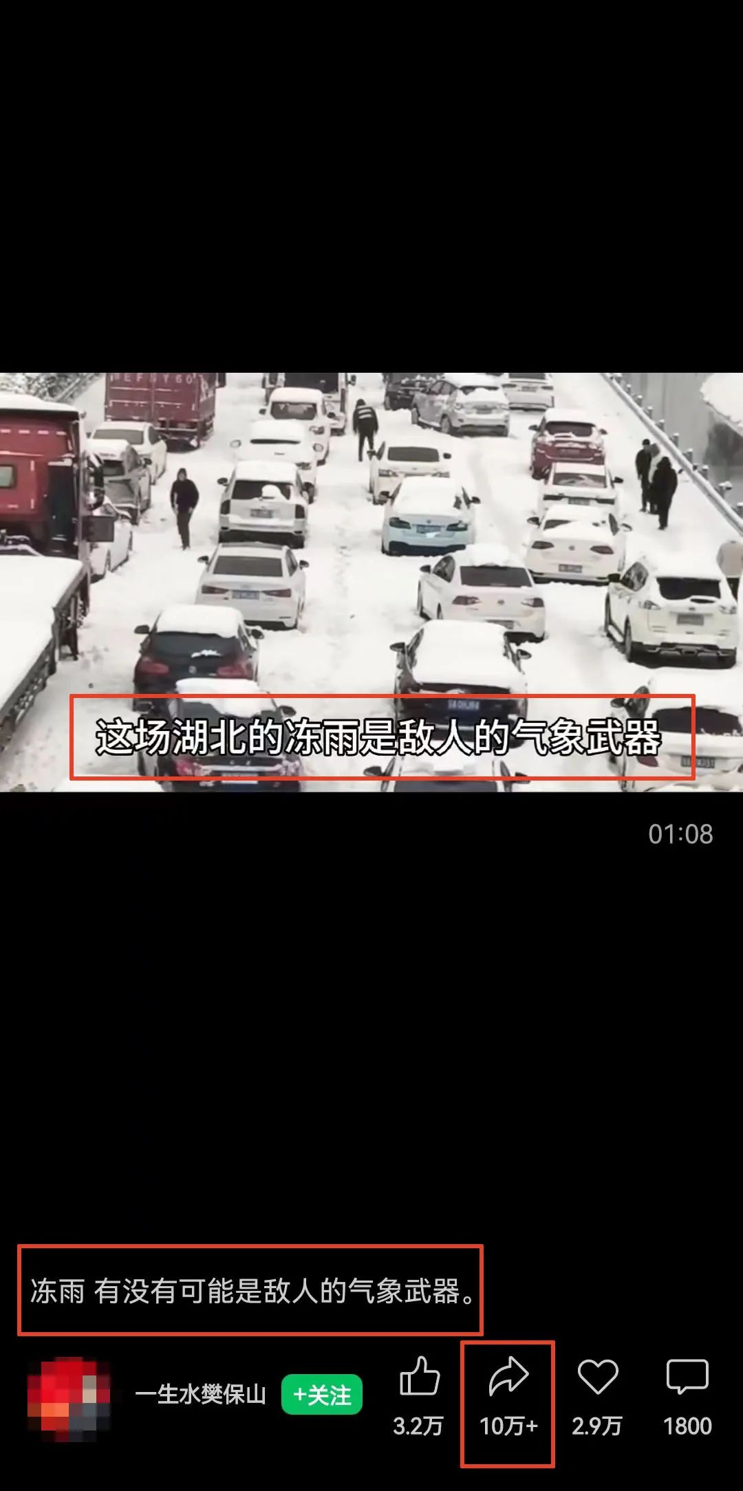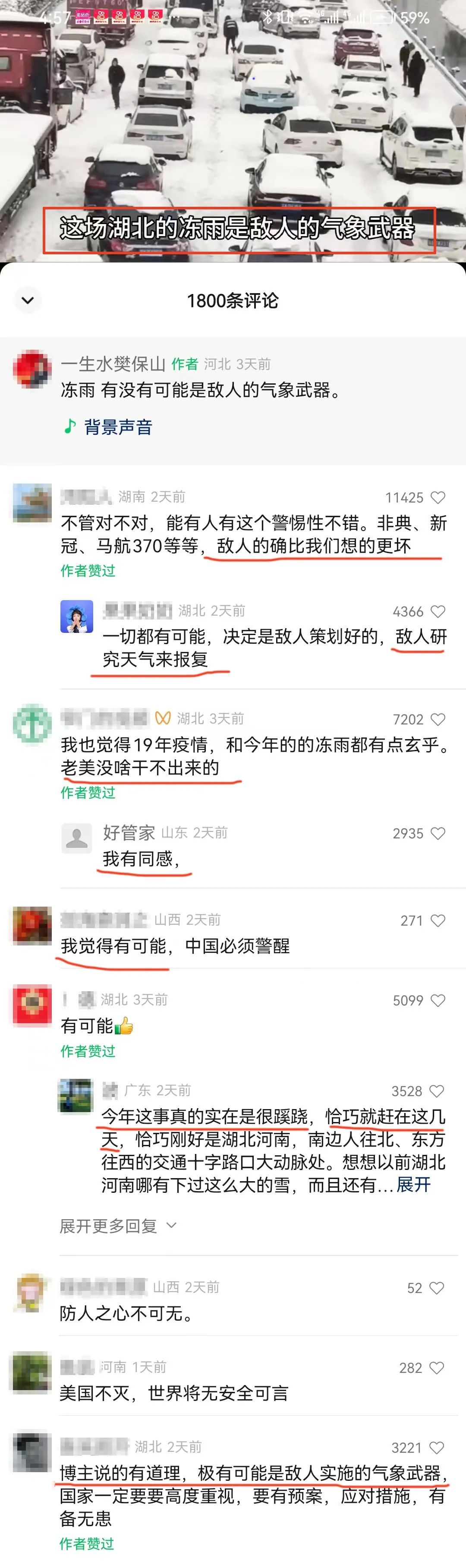 我一直想要用写作来传递一些理性的声音,对抗荒谬,但是,在看到这条将湖北冻雨与敌人的气象武器联系起来的视频被转发到10万加时,看到上千条一边倒的留言时,我有一种很深的挫败感。