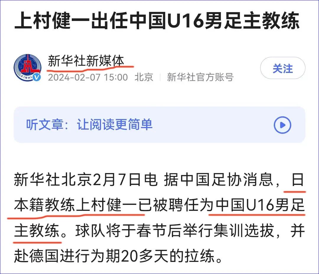 网上看到一则消息,日本籍教练上村健一被聘任为中国U16国家男子足球队主教练。