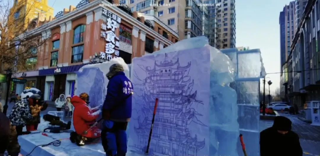 最终确定的图样是黄鹤楼和武当山,刘坤立刻修改方案,一夜未眠。三个小时后,雕刻负责人叶师傅接到刘坤的通知,跑去打印图纸,做新的规划设计。拿到新方案后,雕刻师傅们接力抢工期,加班加点地干了两天,码冰到零点,雕刻到凌晨三点多。