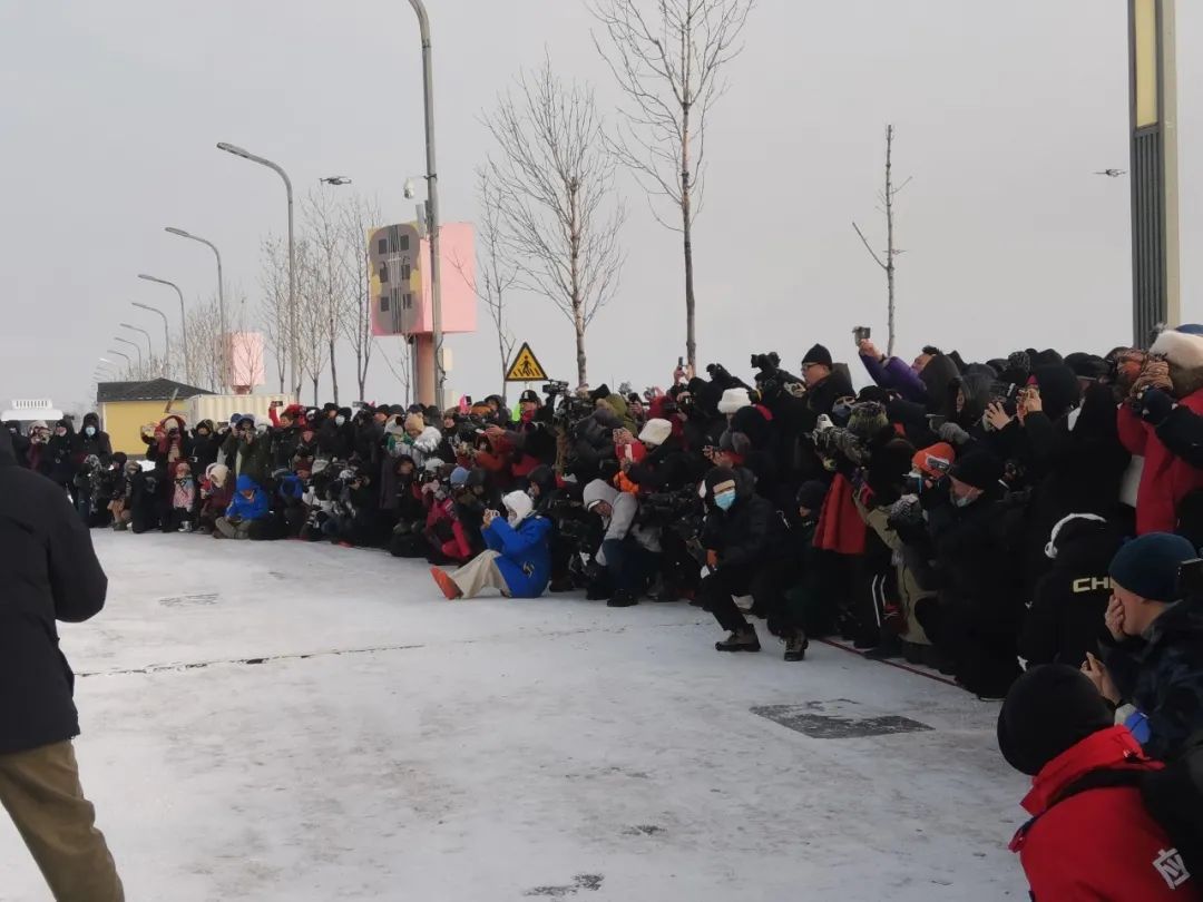 黑压压的人群不为所动,谁都不想第一个挪动脚步。最终多名工作人员出动,把人们踩到脚下的警戒线拉了起来,在红线的束缚下,大家暂时和解,进入摆拍环节。