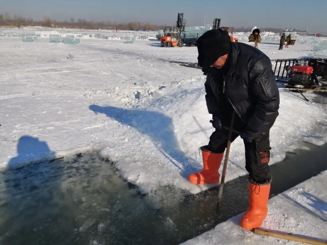 起重机没有出现在松花江边时,采冰依靠人拉肩扛,绳子一端绑在700斤重的冰块上,一端绑到人的肩膀和后背上,师傅们像纤夫一样,用尽全身力气把冰块从江里薅出来、拽出来。一个有20多年采冰经验的师傅说,“再没有机器,我们都干不动了。”雇佣公司这才花钱购买了机器,一台起重机一万多块,相当于两个采冰工的生产效率。