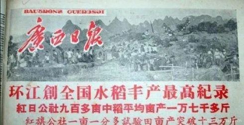 榜样的力量是无穷的,话说广西环江县委发现自己远远地落后于兄弟县市,心里很着急,决定要〝争全区第一,全国第一,天下第一〞。于是,1958年9月12日《广西日报》头版整版放了一颗巨型卫星,广西环江红旗公社水稻亩产13万斤!