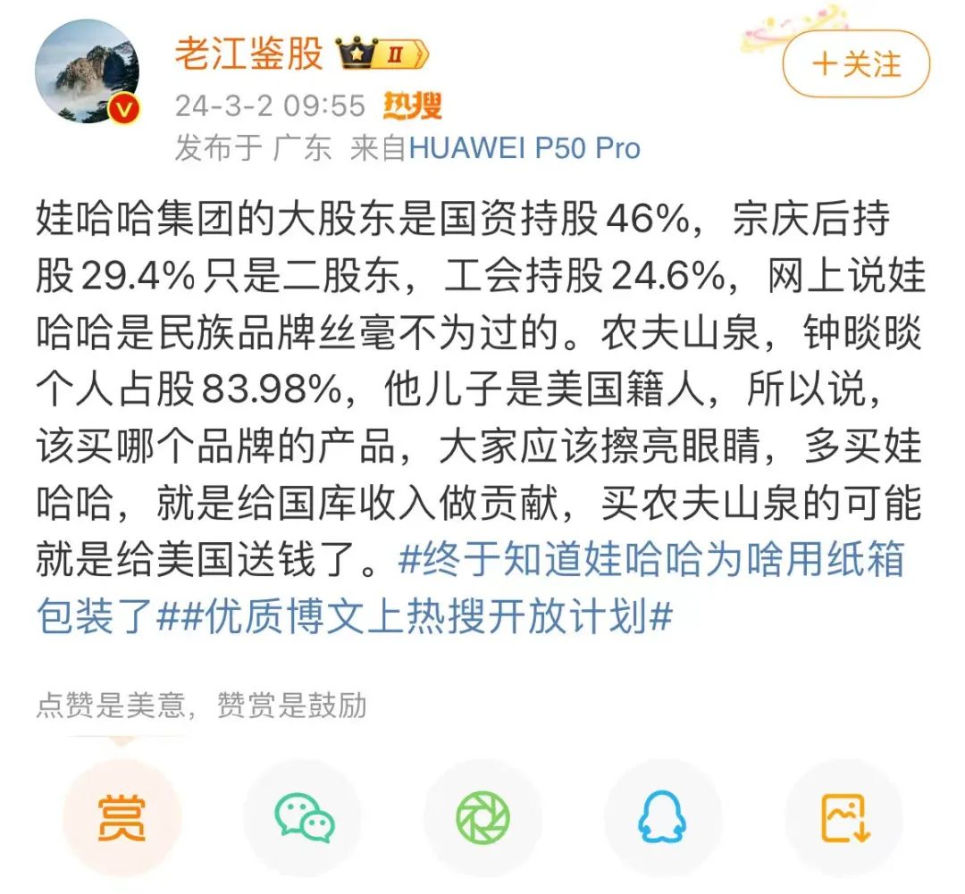 比如有人写道:娃哈哈集团的大股东是国资持股46%,宗庆后持股29.4%只是二股东,工会持股24.6%,网上说娃哈哈是民族品牌丝毫不为过的。农夫山泉,钟晱晱个人占股83.98%,他儿子是美国籍人,所以说,该买哪个品牌的产品,大家应该擦亮眼睛,多买娃哈哈,就是给国库收入做贡献,买农夫山泉的可能就是给美国送钱了。