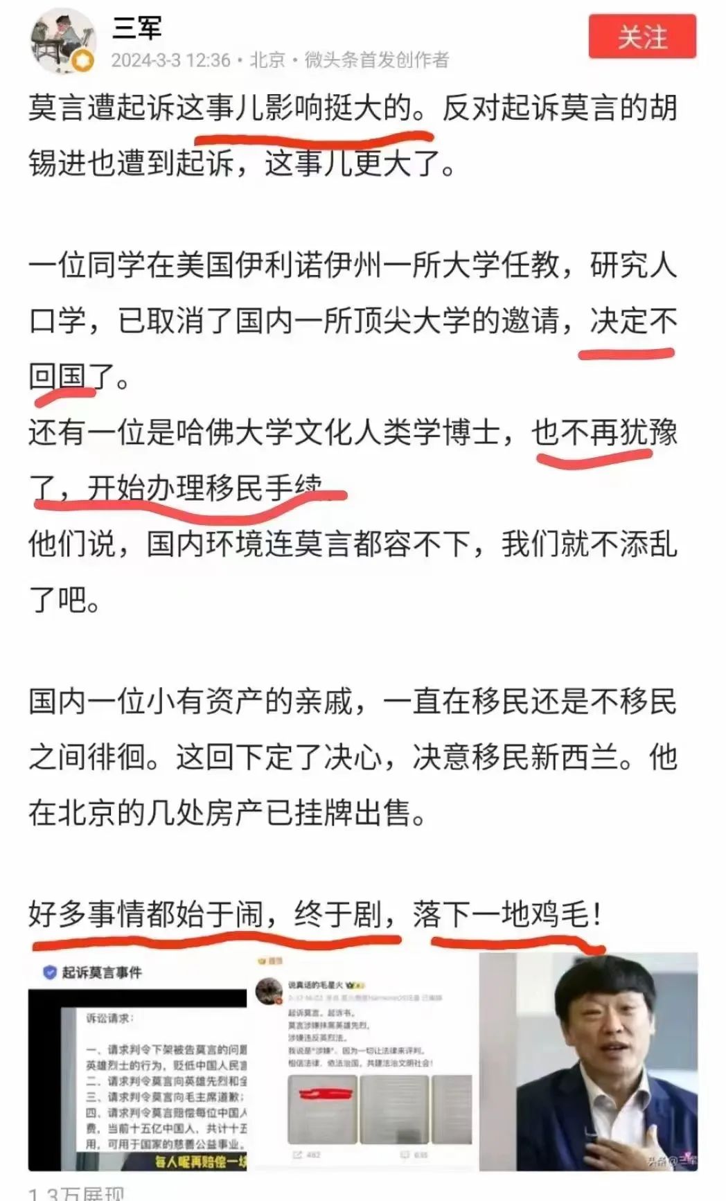 有人说,莫言遭起诉这事儿影响挺大的,甚至有人开始移民了——我不太相信这个闹剧有这么大的威力,但是,起诉莫言与前面那个帖子讲买某某产品就是给外国人人送钱的逻辑是一脉相承的,都透着不可理喻的狭隘与无知,都是对现代文明常识的自我隔绝。