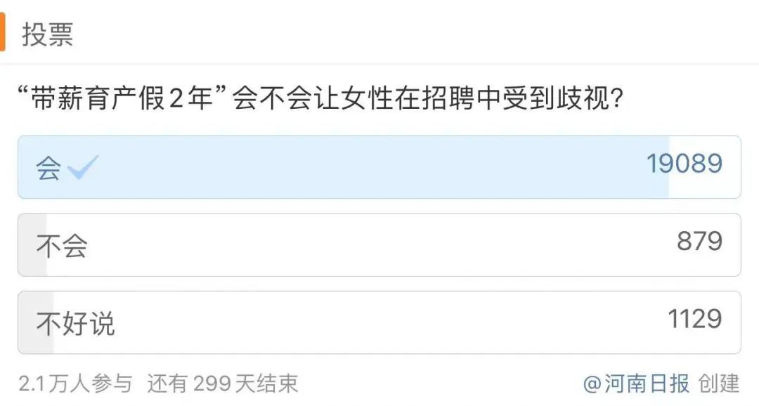 微博上河南日报做了个调查,在2.1万名投票的网友中,1.9万都认为这个建议如果实施,会导致女性在招聘中被歧视,只有800多人认为不会。