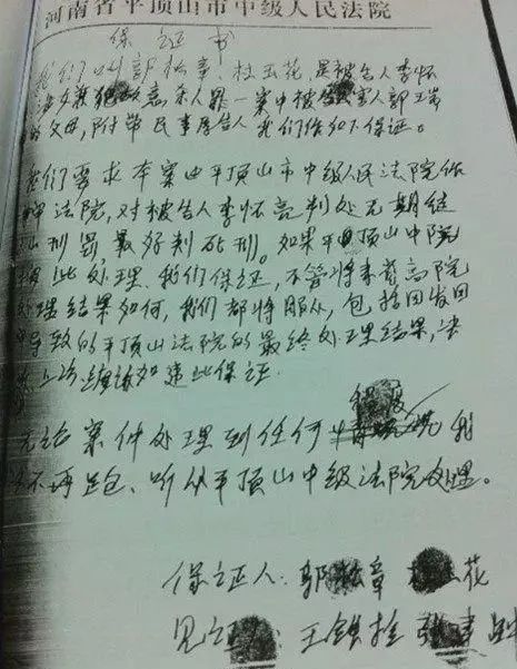 当时一位法院副院长也表示,为了不让被害人家属四处告了,他和对方谈了一天,表态可以由中院提审,尽量判李怀亮死刑,被害人家属同意并写下保证书,承诺如果法院按此处理,就不再四处告。