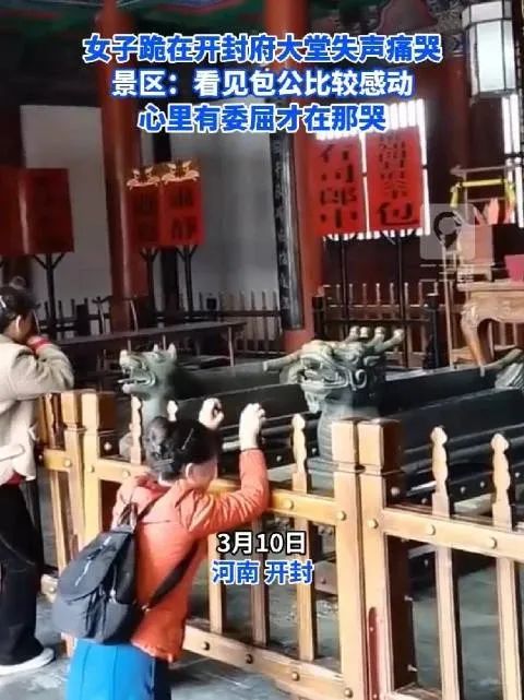 一位女游客跪在开封府景区府衙大堂之前痛哭失声,似有无尽冤情和委屈要向包青天哭告。
