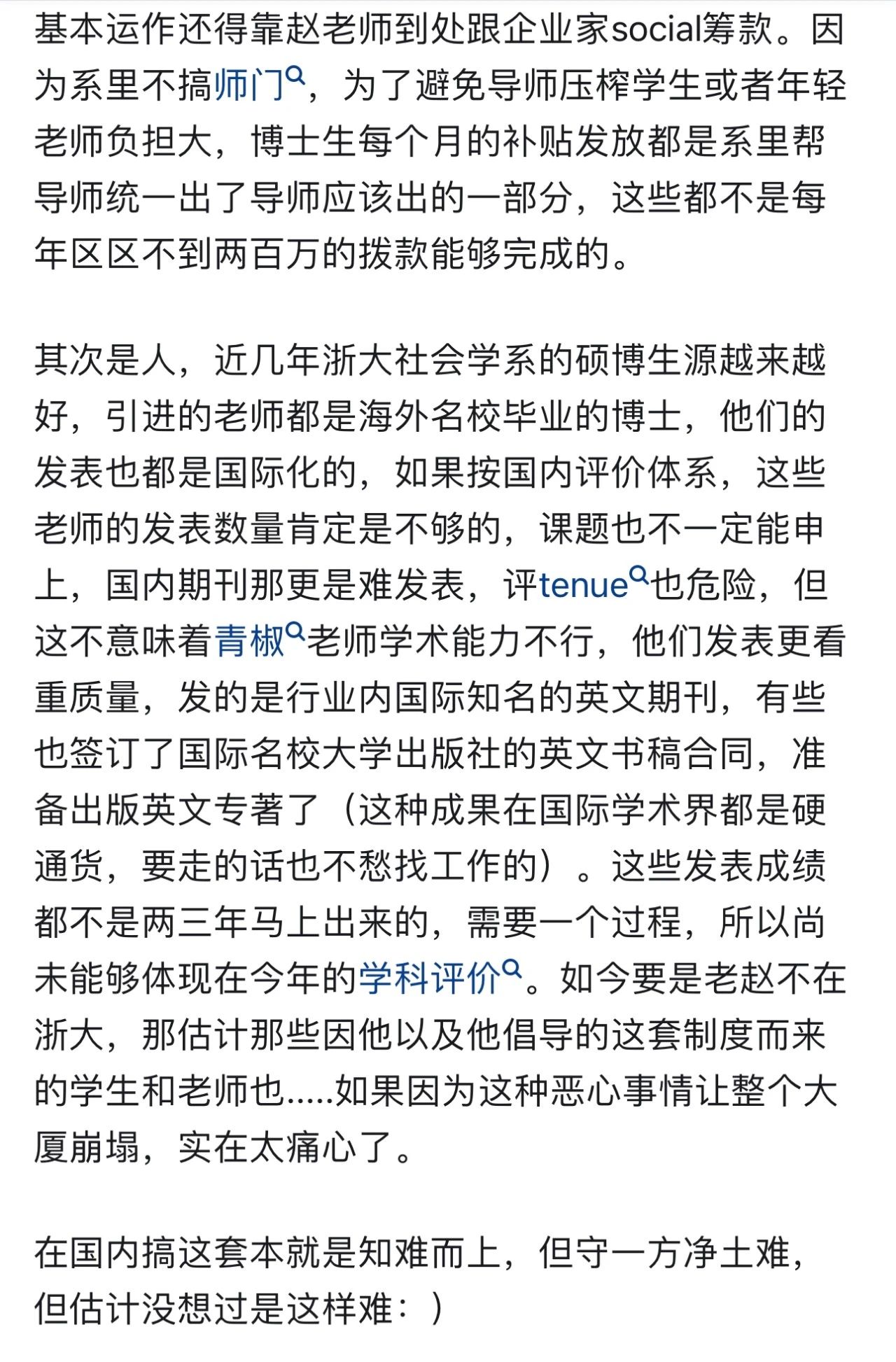 身体里面有热海:圈里有些人在转赵鼎新老师辞职的那篇文章,才知道他退休后一直在浙大。该说不说,浙大有几位青椒老师真的很优秀,这两年也读了他们不少文章,方向很新,视野很广。王婧老师研究听觉文化,赵瑜佩老师研究电竞,吴桐雨老师研究高科技产业技术劳工(大厂996这些),啊才发觉是三位女性研究者。真的拓宽了很多我的认知和视野。以及之前有师姐让我读赵老师有篇写如何提一个好的研究问题的文章。辞不辞的我一个小学生也不能说点啥,但他们都有力地影响过我,也将一直影响着。