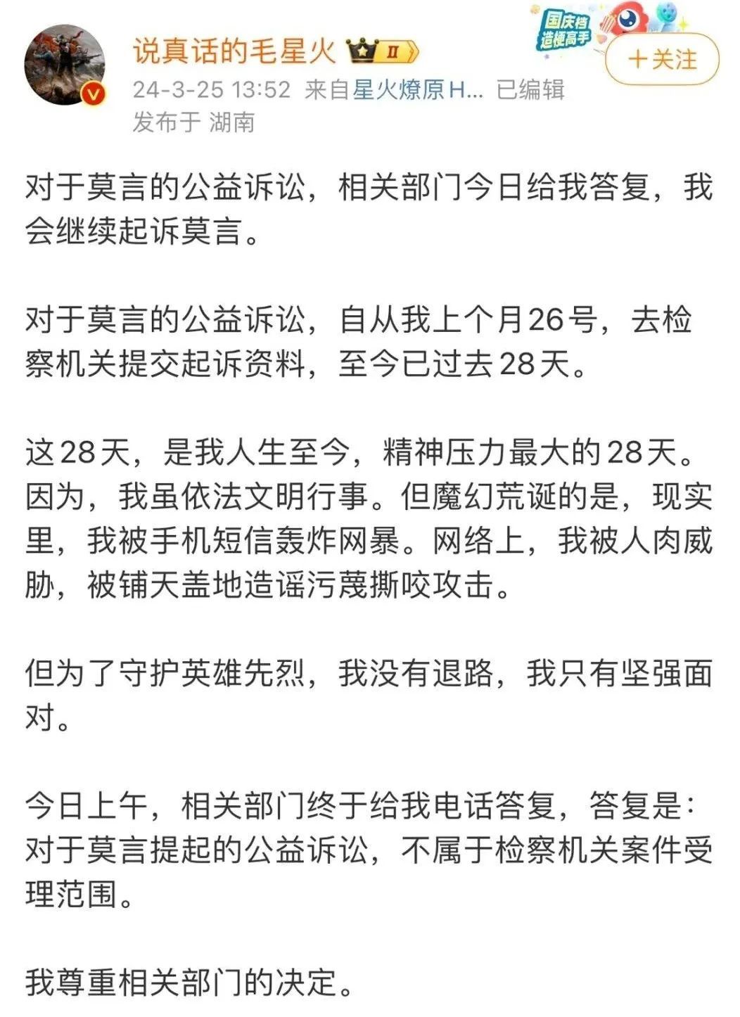 日前,因举报、攻击作家莫言而一举成名的网民毛星火,得到正式答复:他对莫言的公益诉讼,将不被受理。他说,尊重相关部门的决定,但会继续起诉莫言。