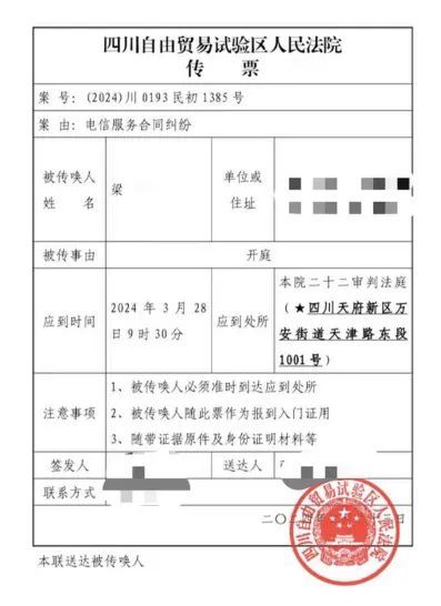 3月28日,此起电信服务合同纠纷在四川自由贸易试验区法院开庭审理。原告梁律师开庭前一日从长沙匆匆赶到成都,准备参加庭审。她今年29岁,2023年正式成为一名专职律师。与梁律师对簿公堂的是四川移动公司,移动公司则是国内四大通信运营商之一。“(被告)出庭人员是移动(四川)公司的代理律师。”梁律师庭后告诉笔者。