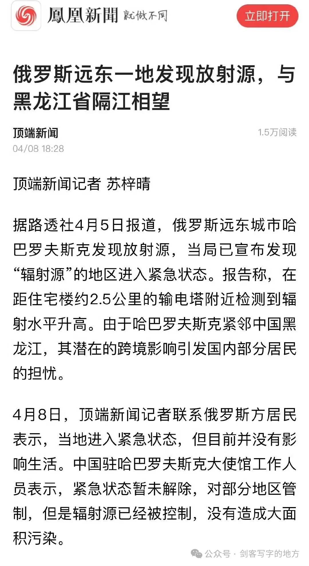 第一,这个哈巴罗夫斯克地区的确出现了放射源,并且距离当地的居民区只有2.5公里。当地自己也宣布了进入紧急状态以及超出正常辐射水平。