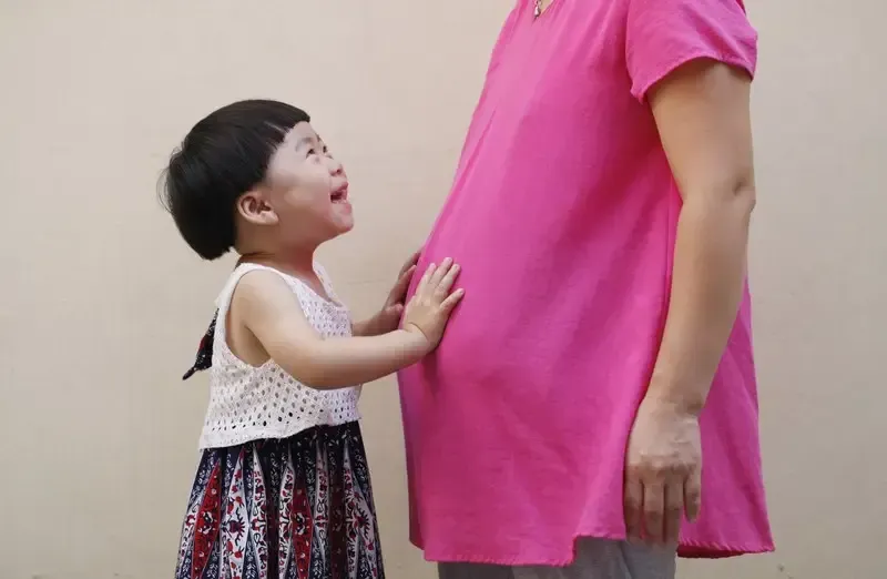 2017年8月5日,一名小女孩和她即将生二胎的妈妈。
